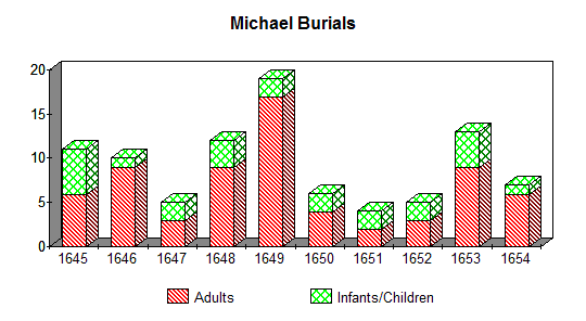 The first year with records is 1647 and is possibly incomplete. The ten-year average is eight and only 1648, 1649 and 1652 rise above this average. 1649 is three times that average. Because the numbers involved are small, the average number of burials for the five years following was also calculated to determine whether the numbers are small from gaps in the records or from the size of the parish. From 1657 to 1661, the average number of burials per year was 11. While two of these years exceed this average, one with 13 burials and another with 16, 1649 is still the highest. The numbers buried most years are so small that even one or two infant or child burials make their percentage large, but in 1648 they make up 20 percent of the burials and in 1649, 23 percent. After 1649 the proportion of infants being buried stays high, but the total numbers being buried are lower. Overall, burials are considerably higher in 1649 with infants and children making up nearly a quarter of the total, meeting two of Appleby’s criteria. The lack of useful baptismal records means that conceptions cannot be considered. Michael The ten-year period considered for Michael for both burials and conceptions is 1645 to 1654. For burials the years 1644 and 1655 are both missing, but the years between them seem fairly complete. Figure 9 shows burials.